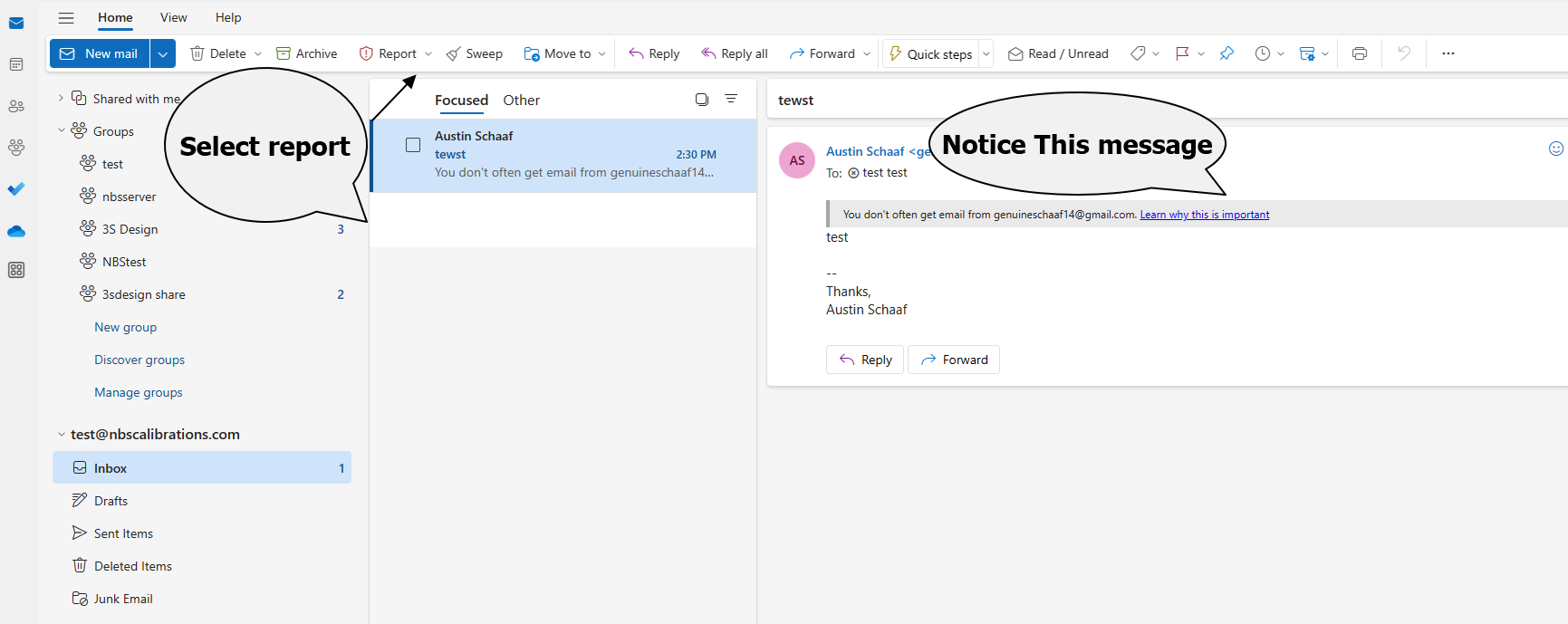 On the Outlook toolbar, click Report (shown at the top of your screen).