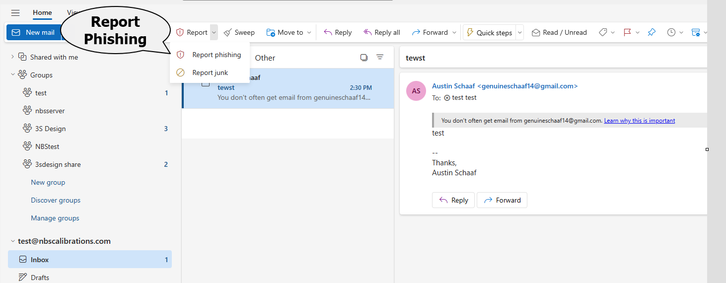 If the Report Phishing button is missing or not working, contact the IT helpdesk at support@threesdesign.net or notify your site admin.